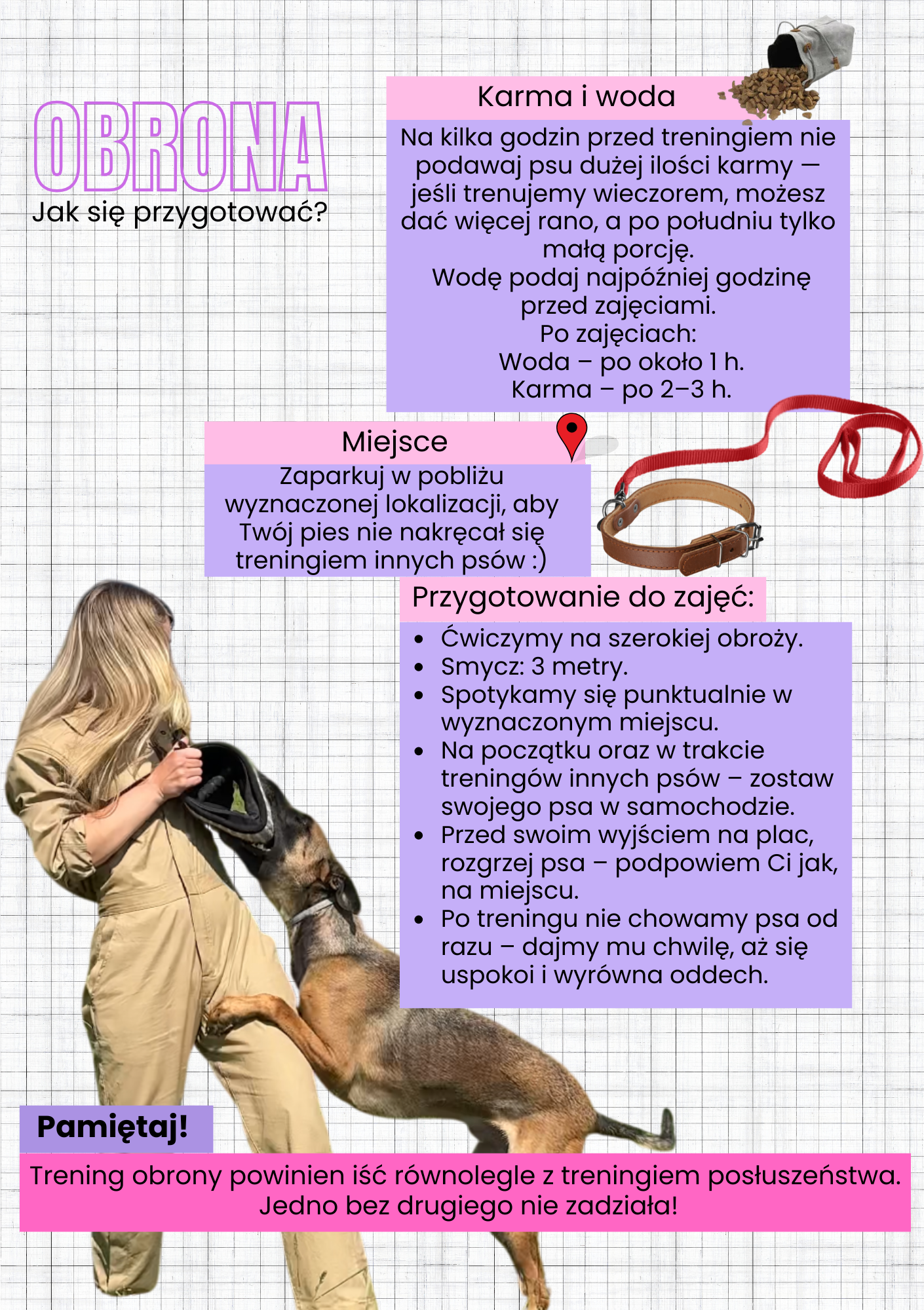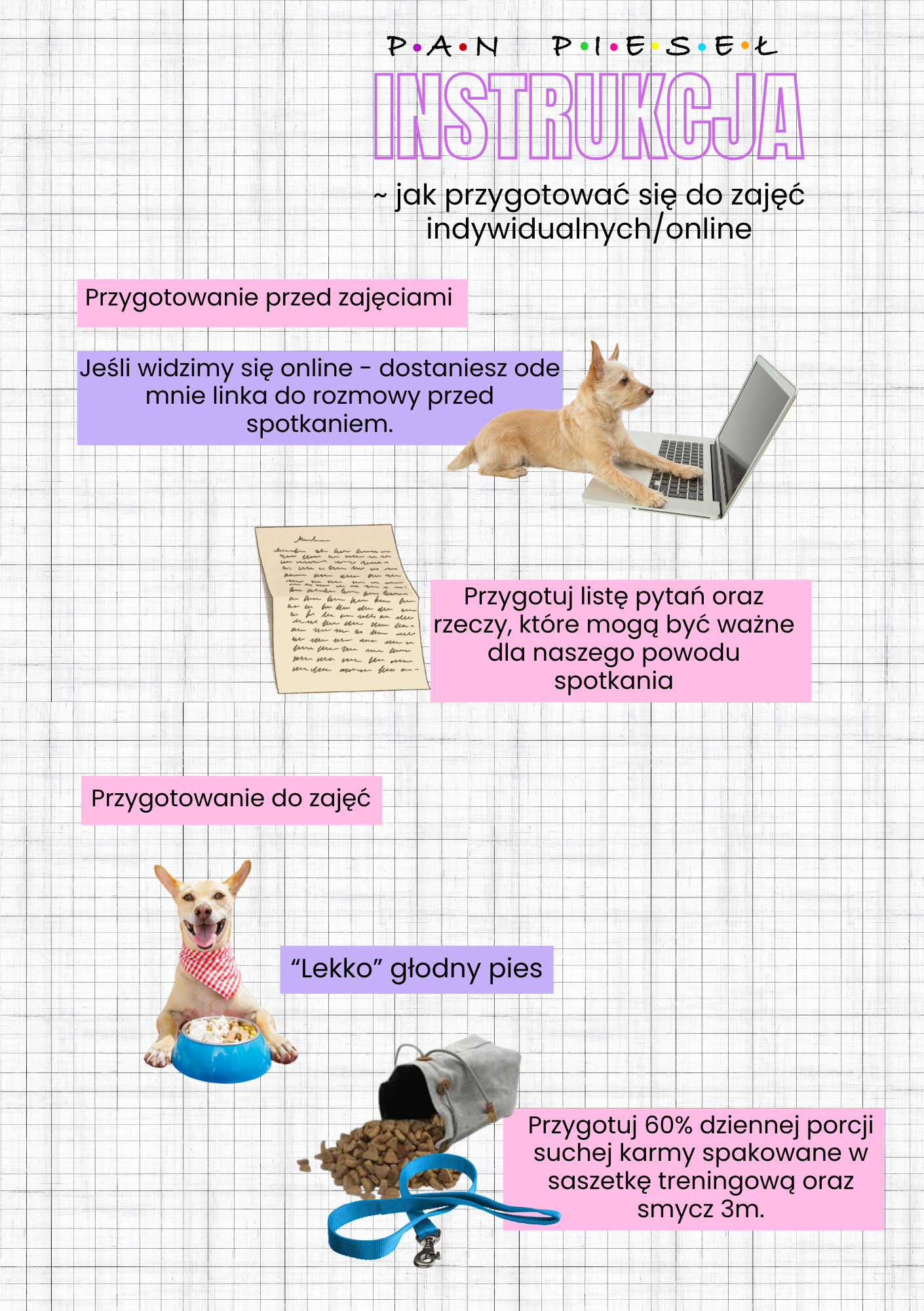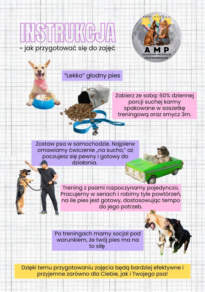Poniżej znajdziesz 3 instrukcje, jak przygotować się do zajęć. Kliknij w obrazek, by pobrać tę która potrzebujesz. Konsultacje indywidualne stacjonarne/ online Zajęcia grupowe Obrona Informacje Dane firmy Regulamin Zwroty i reklamacje Polityka prywatności i cookie Kontakt Szkolenia ul. Klonowa 10, Chorzów tel. 791875201 panpieselshop@gmail.com Facebook Instagram Tiktok Kontakt Groomer ul. Armii Krajowej 5, Tychytel. 536787457 Facebook Instagram Calendar-check